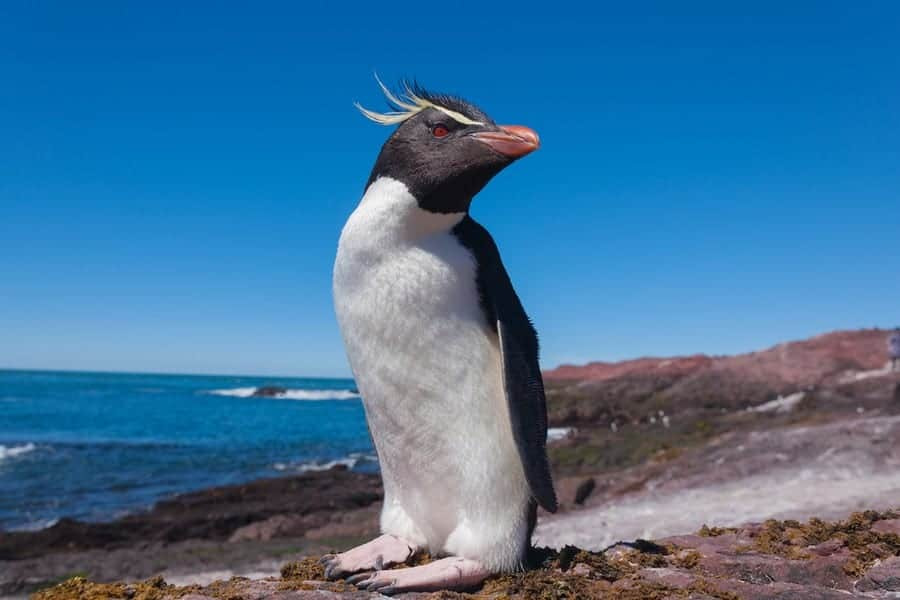 Rockhopper Penguins are easily distinguishable due to their distinctive yellow and black plumes and red eyes. Smaller than many other penguin species, these birds stand around 23 inches (58 cm) tall and weigh approximately 5 to 10 pounds (2.3 to 4.5 kg). Their name comes from their habit of hopping over rocks and obstacles rather than sliding on their bellies. They inhabit rocky, rugged coastlines where they lay their eggs and raise their chicks in nests built from stones. Their diet primarily consists of krill, squid, and small fish. Known for their feisty nature, Rockhoppers have a spirited demeanor.