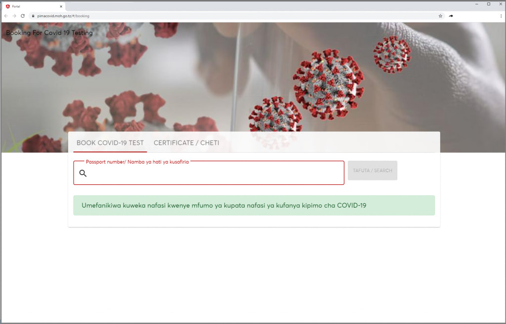 When submitted, you will see this statement, “Umefanikiwa kuweka nafasi kwenye mfumo ya kupata nafasi ya kufanya kipimo cha COVID-19.” This means, “You have successfully placed a system on the system to get a chance to perform a COVID-19 test.”