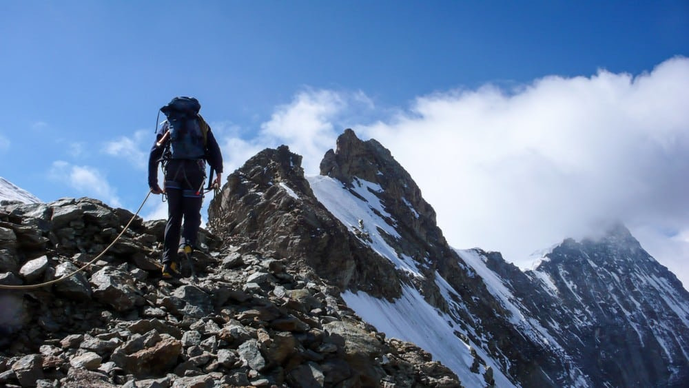 Summit day begins before dawn. The climb is a continuous sequence of rock, snow, and mixed terrain with fixed ropes in some sections. Exposure is constant, and climbers often move roped together for speed. The descent follows the South Ridge to Mönchsjoch, taking another 5–7 hours. Round-trip time from the hut averages 10–12 hours.