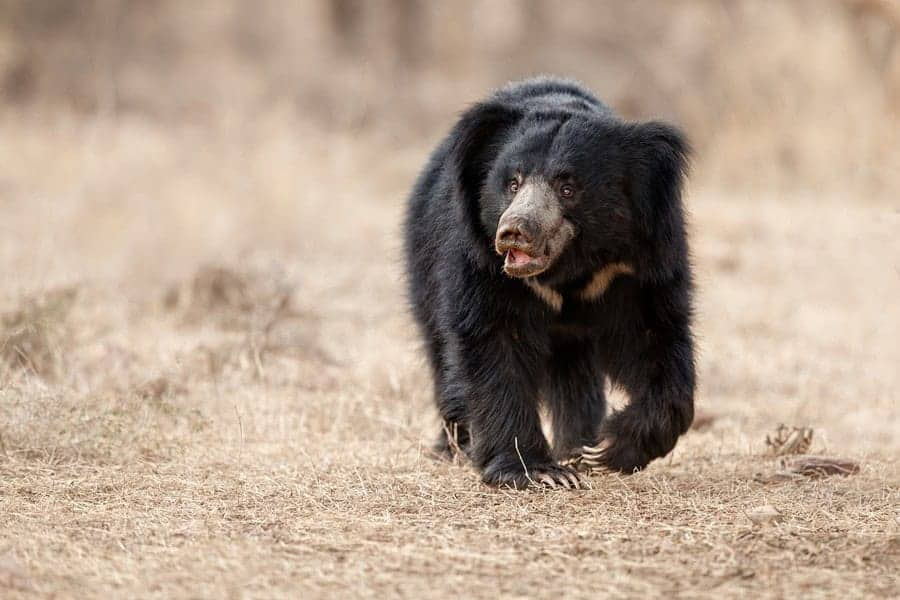 Sloth bears are native to the Indian subcontinent, found in India, Sri Lanka, and Nepal. Unlike other bears, they are primarily nocturnal and feed mostly on termites and ants. They have a long, protrusible lip and a gap in their front teeth through which they can suck insects out of their nests. Sloth bears are medium-sized, generally 5 to 6 feet (1.5 to 1.8 meters) in length and weigh 175 to 310 pounds (79 to 140 kilograms). They have shaggy, black coats with a ‘V’ or ‘Y’ shaped white or yellow chest patch. Sloth bears are the only bears that carry their young on their backs, a trait more commonly associated with primates.