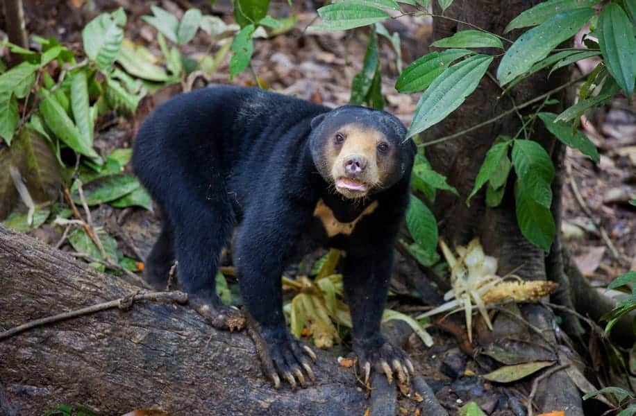 Sun bears are the smallest of the bear species and are found in the tropical forests of Southeast Asia, ranging from India to Vietnam and south to Indonesia. They measure about 4 to 5 feet (1.2 to 1.5 meters) in length and weigh 60 to 150 pounds (27 to 68 kilograms). These bears haver sleek, black fur with a distinctive orange to cream-colored chest patch that resembles a rising sun, hence their name. Sun bears are excellent climbers and spend a significant amount of time in trees where they forage for food and rest in nests built from branches. Their diet is omnivorous, consisting of fruit, nuts, insects, small vertebrates, and the occasional raid on beehives.