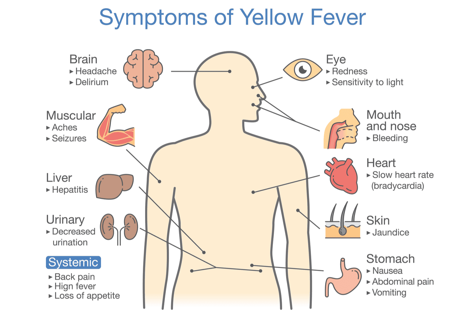 Medical treatment of yellow fever focuses on easing symptoms, including rest, fluids, and use of medicines to help relieve fever and aching. Hospitalization is often needed.