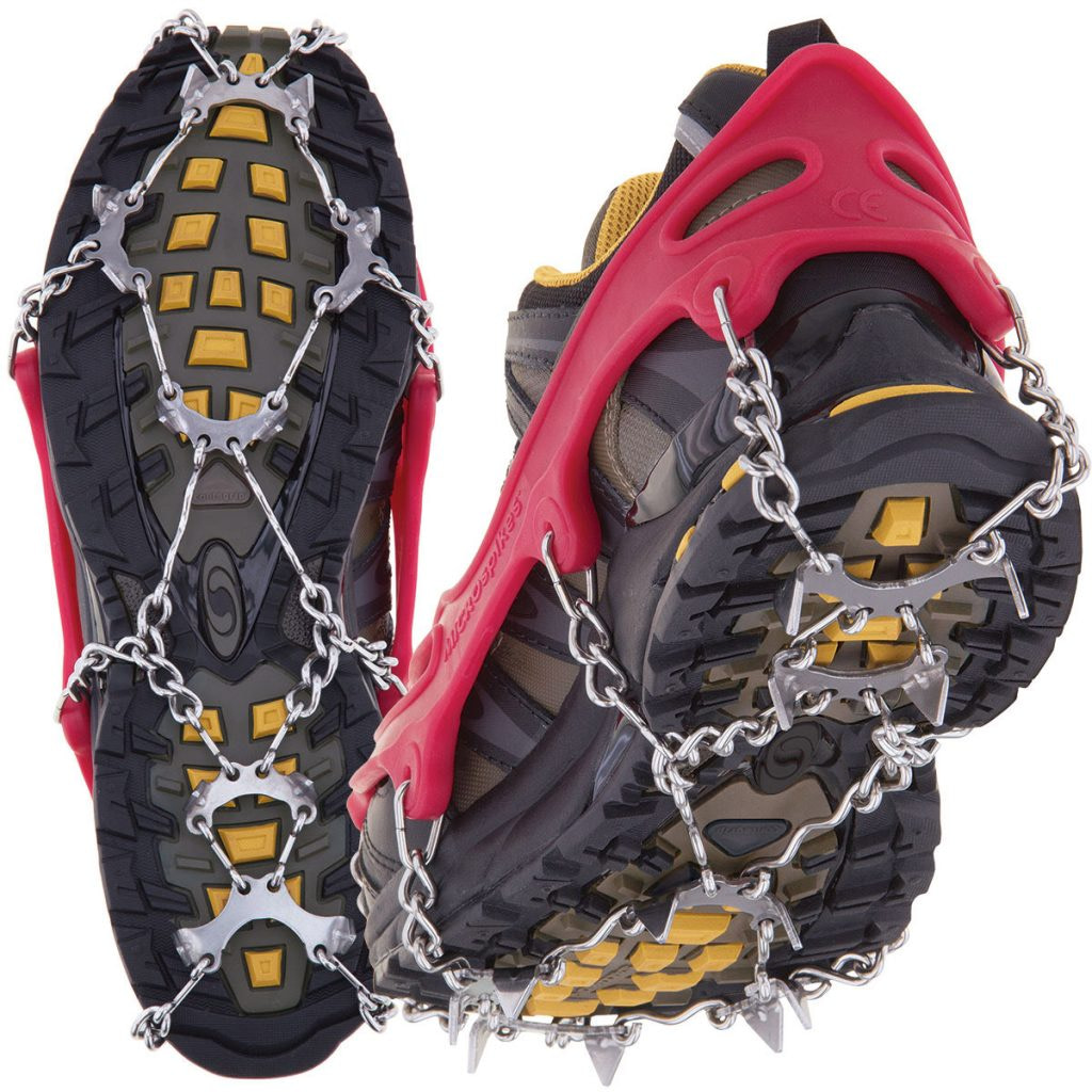 Microspikes (also called micro-crampons or traction cleats) utilize a network of spikes and chains to bite into frozen terrain. The spikes are connected to chains and an elastic harness. The top part of a microspike stretches over hiking shoes or boots and secures the device in place. These are available from Katoola for $70.