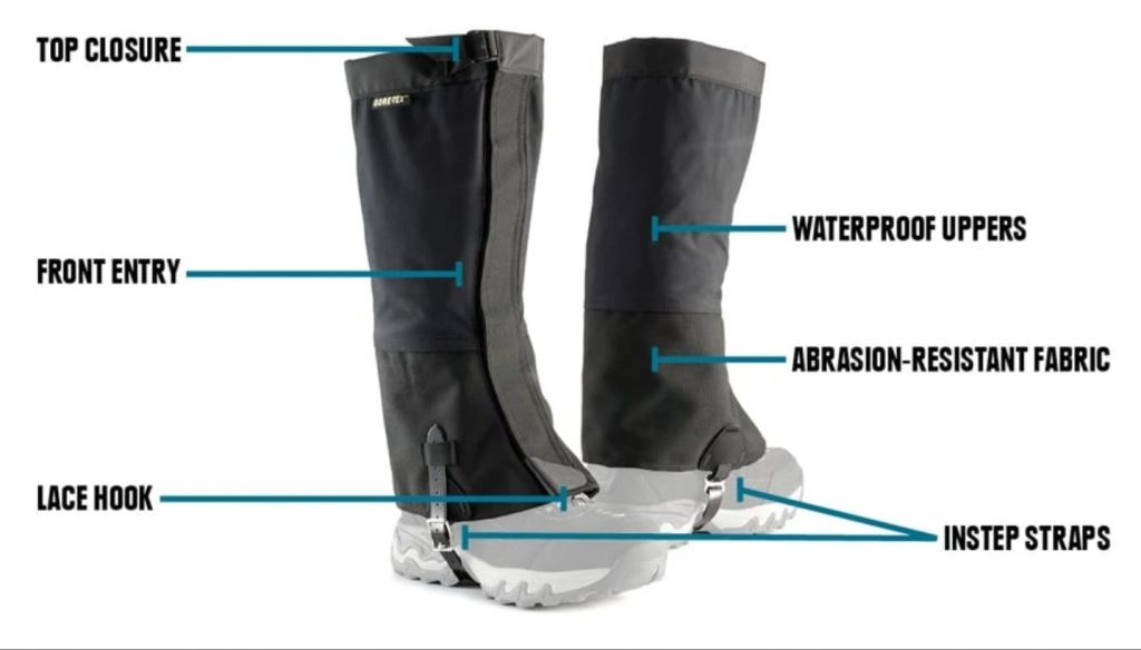 Gaiters are fabric sleeves which cover the upper boot, ankle and usually lower leg. The main reason they are worn is to close the gap between the pants and boots, preventing things from getting inside your footwear. This includes snow, rain, gravel, mud, dirt, plant matter, and anything else you might come into contact with on the trail. Furthermore, gaiters guard against abrasions from bushes and rocks, and provide added insulation for you lower legs.