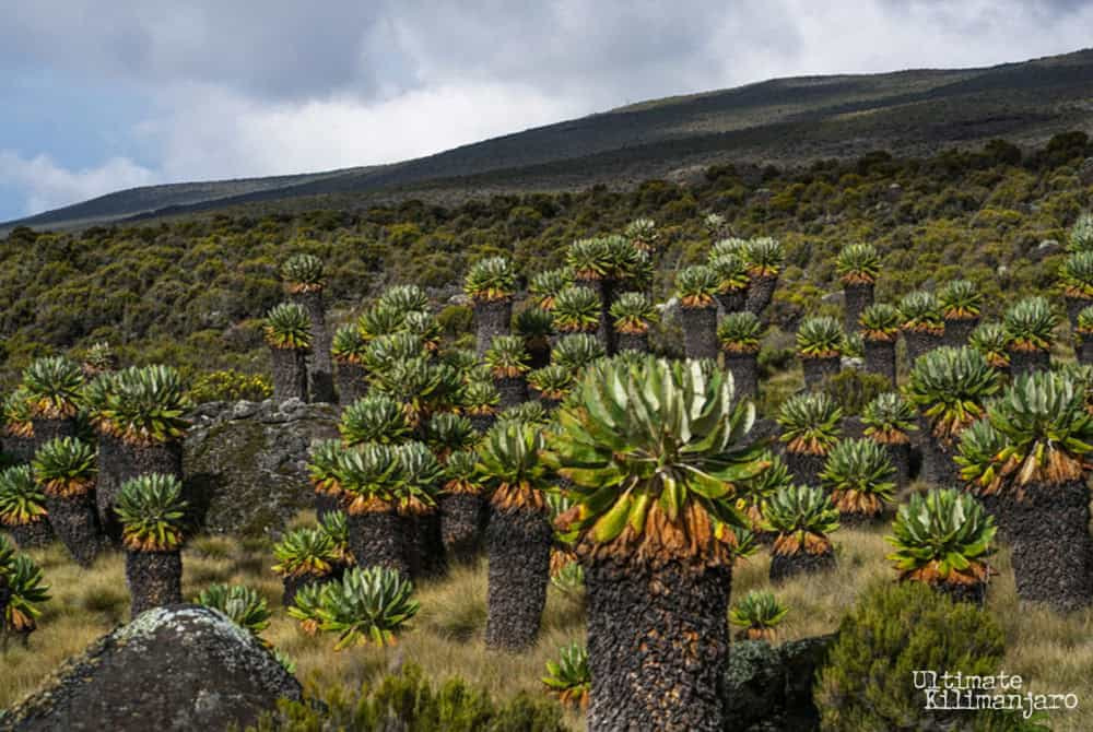 As we move higher, the humidity and dense forest surroundings begin to give way to drier air and cooler temperatures. The flora thins into smaller shrubs like heather, and the presence of fauna becomes increasingly scarce. The most prominent flora are the unique and iconic Senecios (also known as groundsels) and Giant Lobelias. Kilimanjaro’s giant Senecios and Lobelia are endemic to the region. The Senecios, which translates from Latin to “old man,” have thick weathered stems topped with large, succulent rosettes. Lobelias resemble oddly-shaped palm trees with rosettes that close in the evenings to guard against the chilly night temperatures.