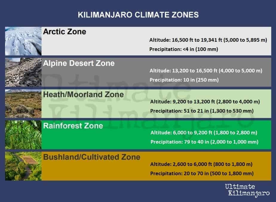 Below are Mount Kilimanjaro’s climate zones from the lowest to the highest altitude along with the average annual precipitation and zone characteristics.