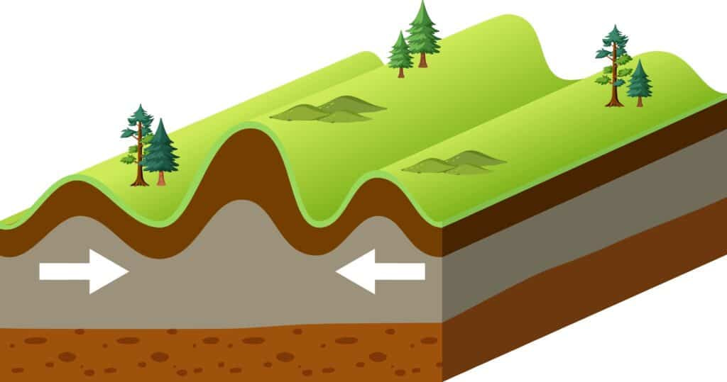 Similar to how a piece of paper folds when pushed together, fold mountains have upward folds called anticlines and downward folds called synclines. The process of fold mountain formation is called orogeny.