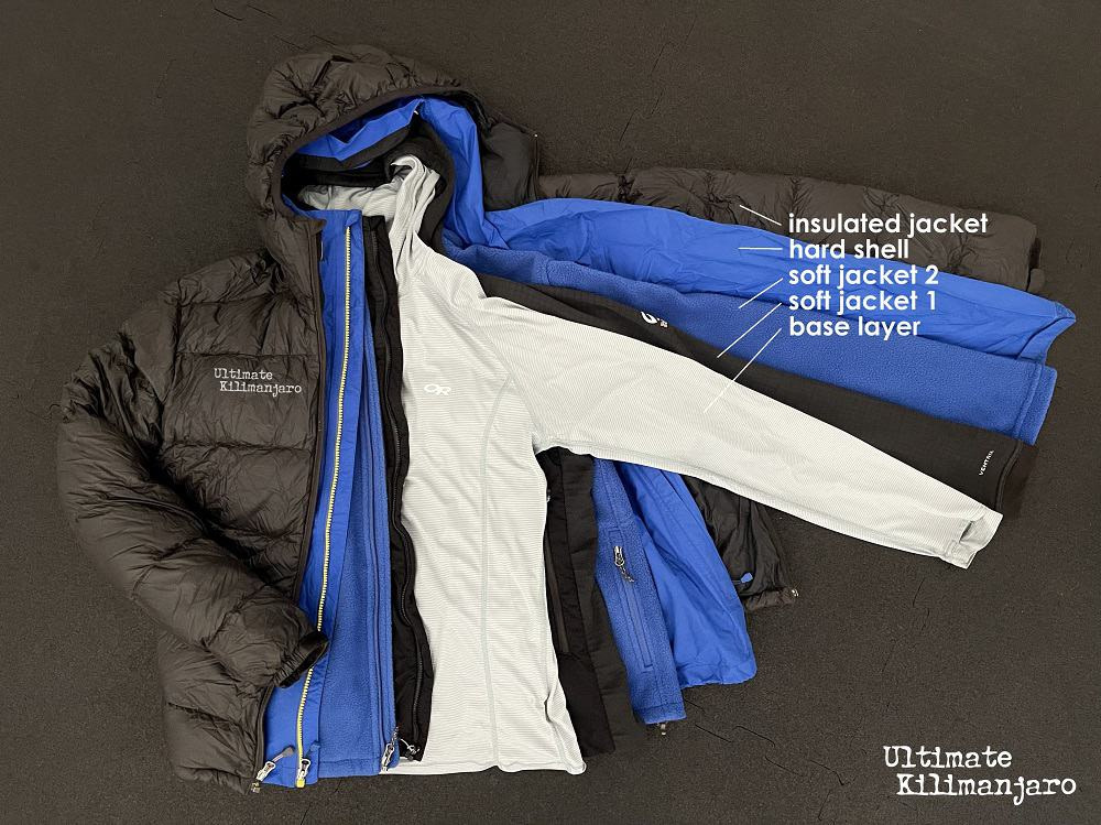 Typically, on summit night, hikers wear four to six layers on the upper body. These layers consist of: