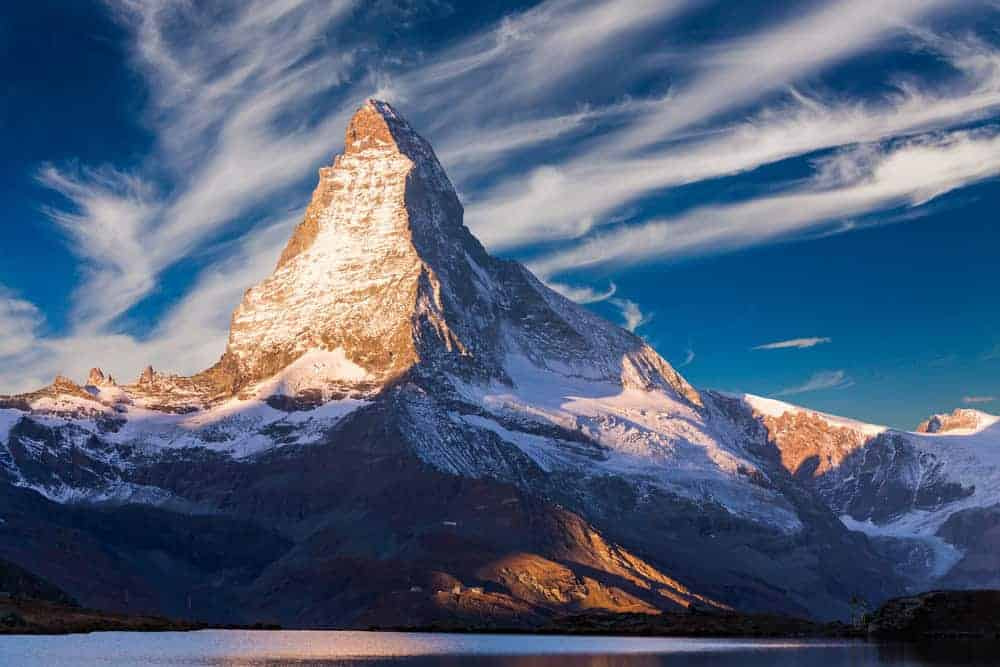 Matterhorn stands 14,692 feet (4,478 meters) tall. It is the 6th highest peak in the Alps (Mont Blanc is the tallest). Its height and sharp silhouette have made it a symbol of the Swiss Alps and one of the most iconic mountains not only in Europe, but on Earth.