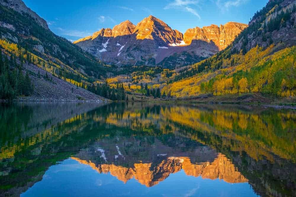 The Elk Mountains are noted for their striking red sedimentary rock. Among these peaks, the Maroon Bells are the most famous, with their distinctive twin summits composed of metamorphic sedimentary mudstone. The deep maroon hue of the Bells, especially when reflected in the serene waters of Maroon Lake, makes them one of the most photographed mountains in North America. While the Maroon Bells are iconic, the highest peak in the range is Castle Peak, which towers at 14,309 feet (4,361 meters).
