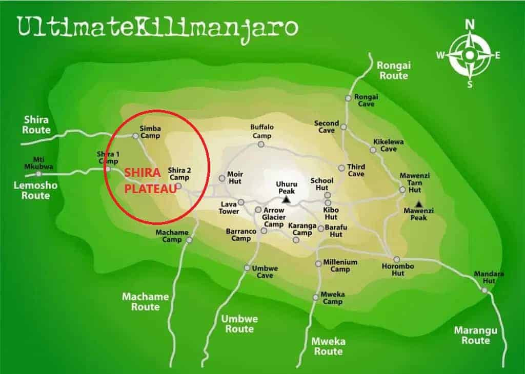 The Kilimanjaro routes that approach from the west cross the entirety of Shira Plateau. This includes the Shira, Lemosho, and Northern Circuit routes. The Machame route, which advances from the south, does not cross the plateau, but does visit the area.