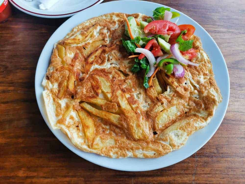Chipsi Mayai is a street food dish combining French fries with eggs, often described as a Tanzanian-style omelette, served with kachumbari or sauce.