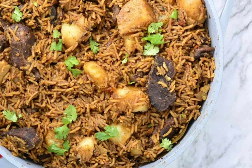 Pilau Nyama is a fragrant rice dish cooked with spices, meat, and sometimes potatoes, offering a rich blend of flavors that is distinctive to Swahili cuisine.