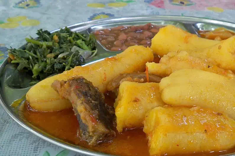 Matoke is a traditional dish made from green bananas, steamed and often cooked with lemon juice, tomatoes, and meat or fish, creating a hearty and flavorful stew.