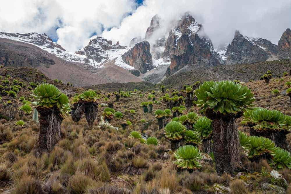 Mount Kenya is the second highest peak in Africa, at 17,057 feet (5,199 meters) tall. The mountain has three summits, two of which are technical peaks (Batian, and Nelion) and one of which is a trekking peak (Point Lenana). The trails offer spectacular, ever-changing scenery including brooding lava towers and glaciers. Naro Moru is the fastest route, and therefore the most popular one, it can be completed over three days.