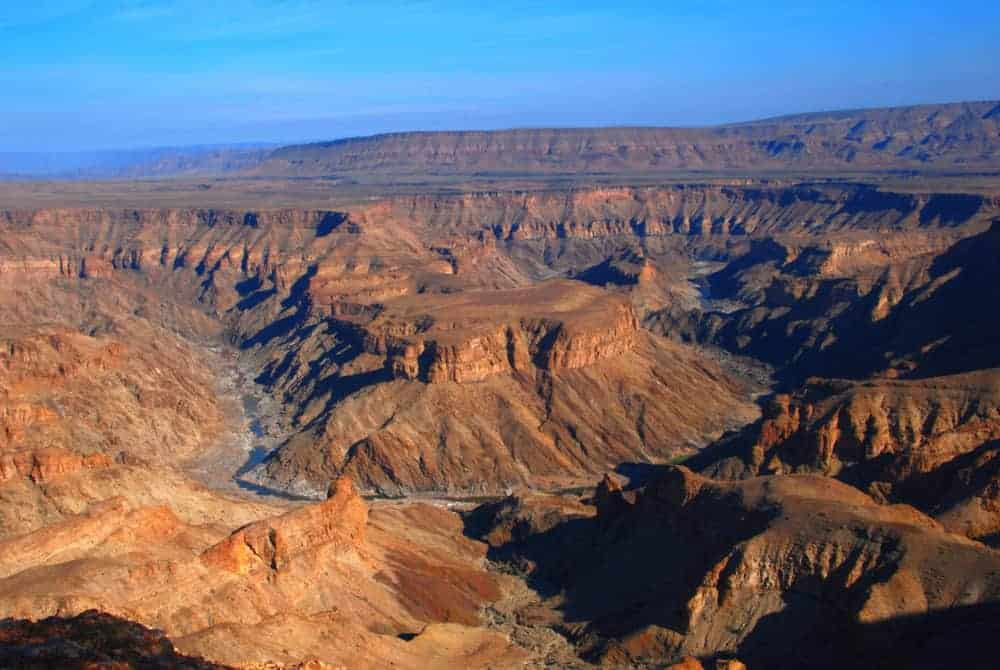The Fish River Canyon in Namibia is the largest canyon in Africa and the second largest canyon in the world, behind the Grand Canyon in the USA. Fish River Canyon is over 500 million years old, with part of the strata formed as far back as 650 million years ago. You can hike almost the entire length of the canyon in four days during the dry winter months. The rugged area is home to large mammals including leopard, mountain zebra, antelope, kudu, and rhinoceros.