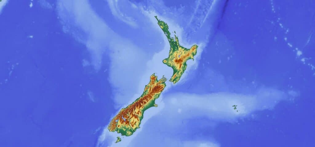 60% of the South Island is covered in mountains called the Southern Alps, the main mountain range in the country. The Southern Alps stretch for 310 miles (500 kilometers) along the western side of the South Island. The range was created by the collision of two tectonic plates – the Pacific and the Australian – that the country sits upon. The Southern Alps are also part of the Pacific Ring of Fire, a region known for its intense tectonic activity.