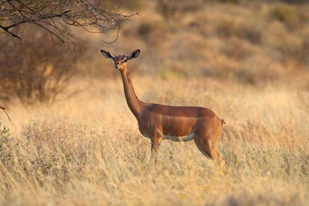 The gerenuk, a type of antelope found in East Africa, has an unusually long neck that allows it to reach leaves high up in trees. It is one of the few antelope species that stands on its hind legs to feed, much like a giraffe. Gerenuks have small heads in proportion to their bodies, giving them a delicate, almost awkward appearance. They are highly specialised browsers, feeding on foliage that other antelope cannot reach.