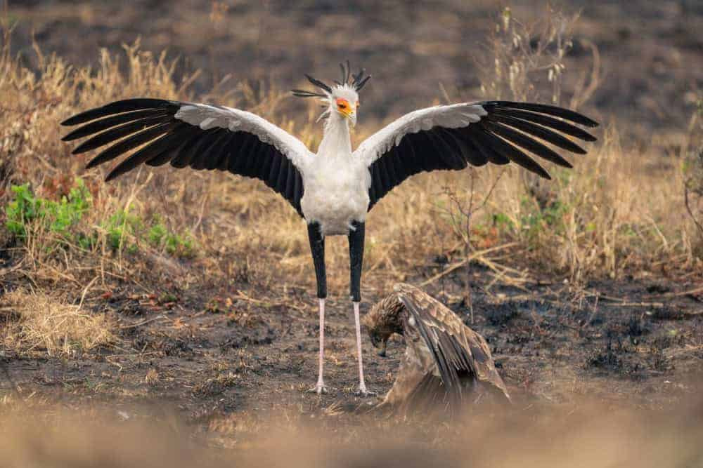 The secretary bird, native to Africa, is a bird of prey. It has black-tipped wings, a grey body, and a crown of long, dark feathers at the back of its head. These head feathers resemble quill pens, giving them their name. In contrast to most birds of prey, the secretary bird hunts on the ground, using its long legs to stomp on its prey, which also includes rodents, insects, small mammals, and birds. Secretary birds are also highly efficient at killing snakes.