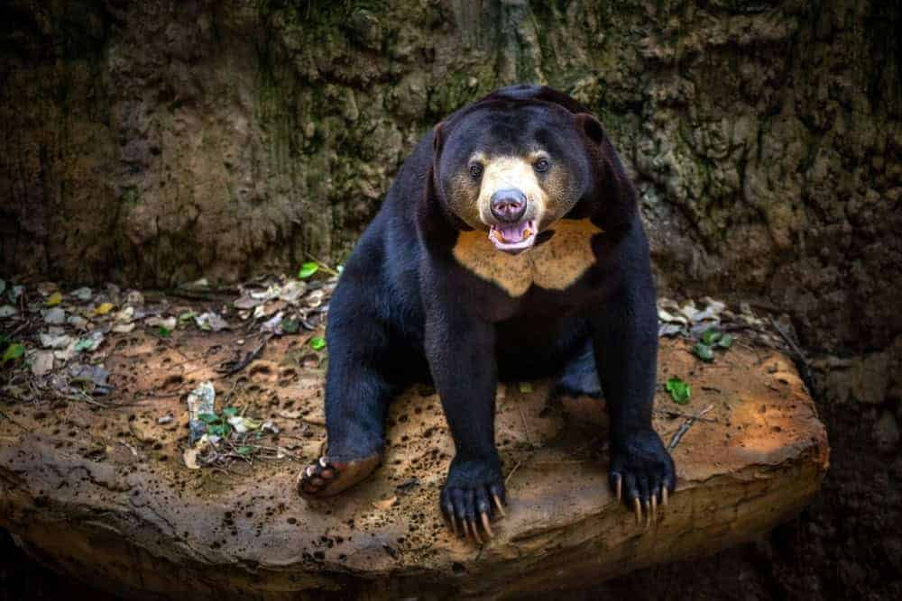 The sun bear, found in Southeast Asia, is the smallest of all bear species, standing only 5 feet tall when on its hind legs. Its most obvious feature is the crescent-shaped patch of yellow or orange fur on its chest, which resembles the rising sun. Sun bears have extremely long tongues, which they use to extract honey from beehives, earning them the nickname “honey bear.” Despite their small size, they are known for being highly aggressive when threatened.