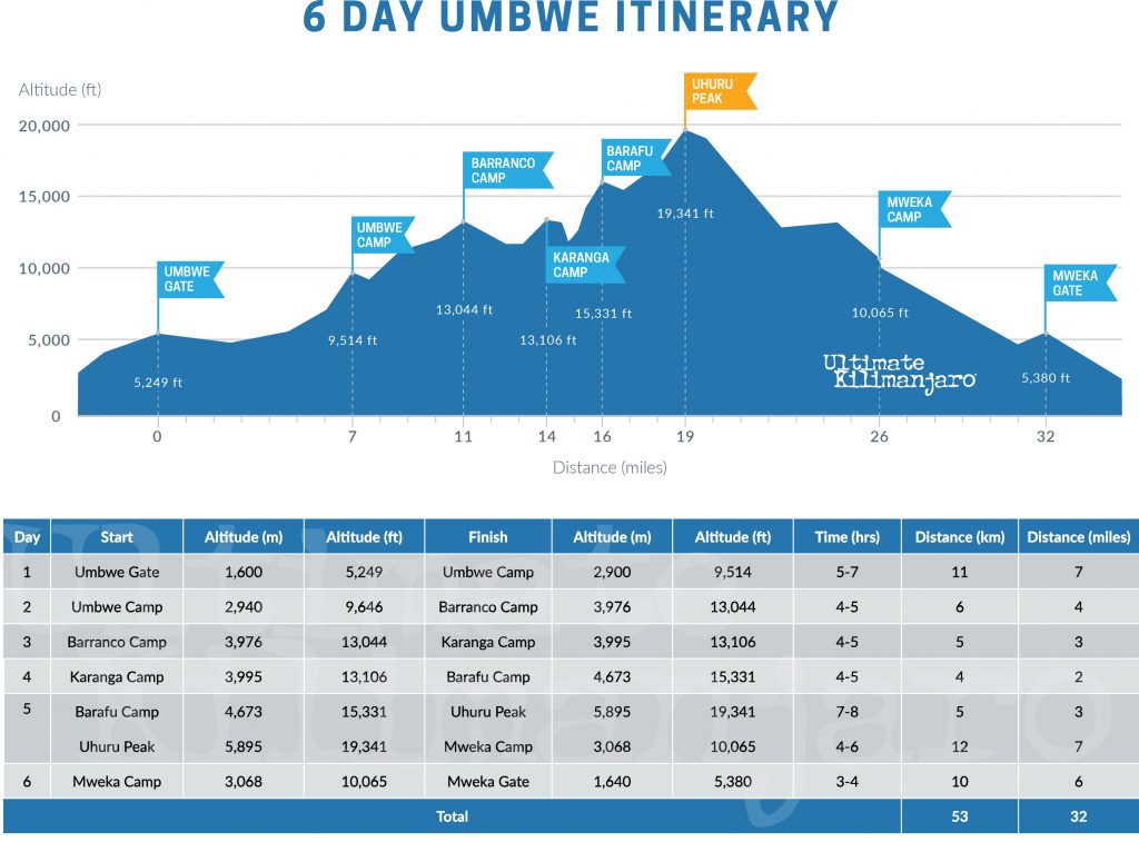 The distance of the Umbwe route is approximately 53 km or 32 miles.