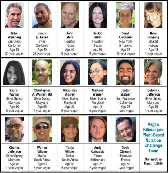 The idea to climb Kilimanjaro started when San Diego native Mike Weinberg wanted to challenge himself in his 65th year. Being vegan for 21 of those years, he found discomfort in the thought of sharing his experience, particularly sharing meals, with non-vegan climbers. He decided to put together a 100% vegan team to exhibit the nutritional power and athletic performance capabilities of a whole food, plant-based diet. To recruit like-minded climbers, Weinberg created the Vegan Kilimanjaro Plant-Based Nutrition Challenge.
