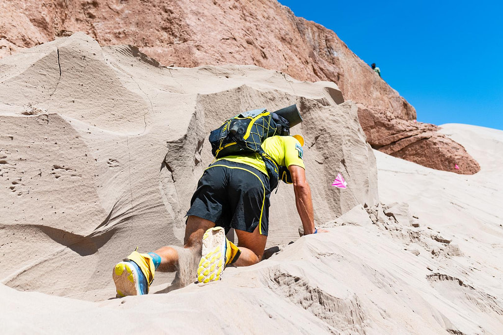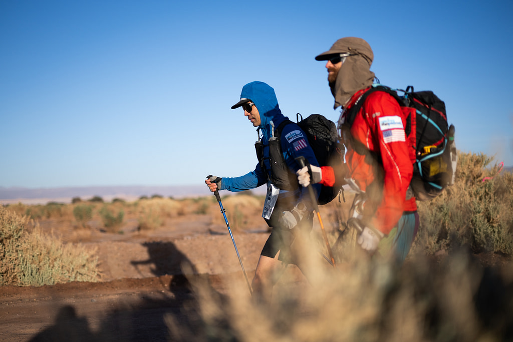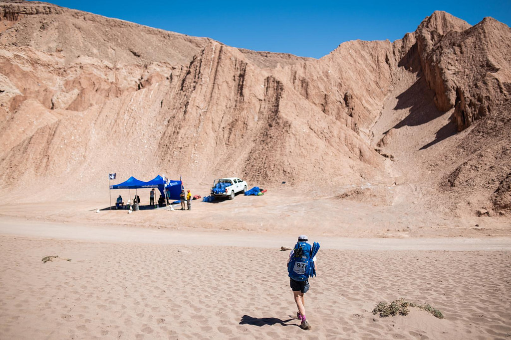 The race is self-supported, meaning you carry everything you need in your pack – food, clothing, medical kit, mandatory equipment. Pack weights typically start around 20 pounds, without water. The organizers provide water and shelter, but nothing else.