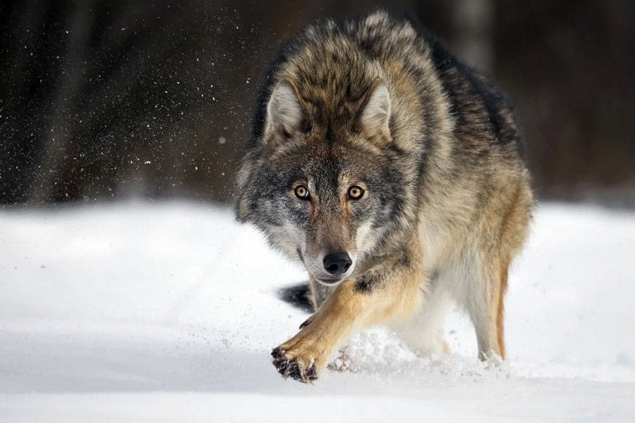 Wolves are acutely able to hear and attune to the high-frequency sounds of their environment. These apex predators are capable of hearing ultrasonic frequencies up to 6 miles (10 km) away in the forest and even farther in open terrain. This ability allows them to detect the movement of prey, from the breaking of twigs to soft footsteps. When visibility is low due to snow, they can hear prey beneath the snow.