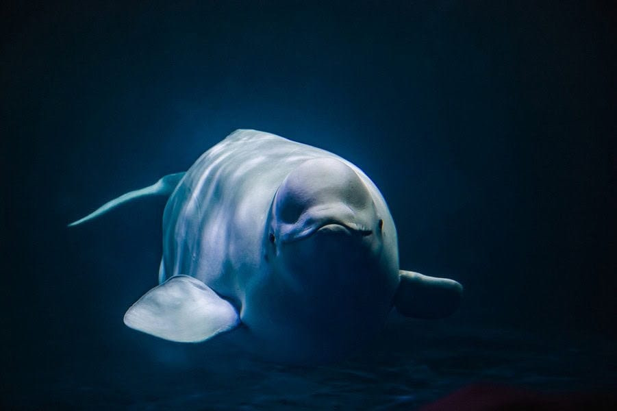 Known as the “canaries of the sea,” Beluga Whales are very vocal animals, the most vocal of all whales. And what is more fascinating is that their moos, clicks and chirps are in the range that is audible to human ears, unlike many other whale species whose calls are at lower frequencies. Their nickname parallels canaries, small songbirds that were traditionally kept in coal mines as an “alert system” – if the canaries stopped singing, it warned of dangerous gases. Similarly, Belugas’ frequent vocalizations indicate the ocean environment’s health.