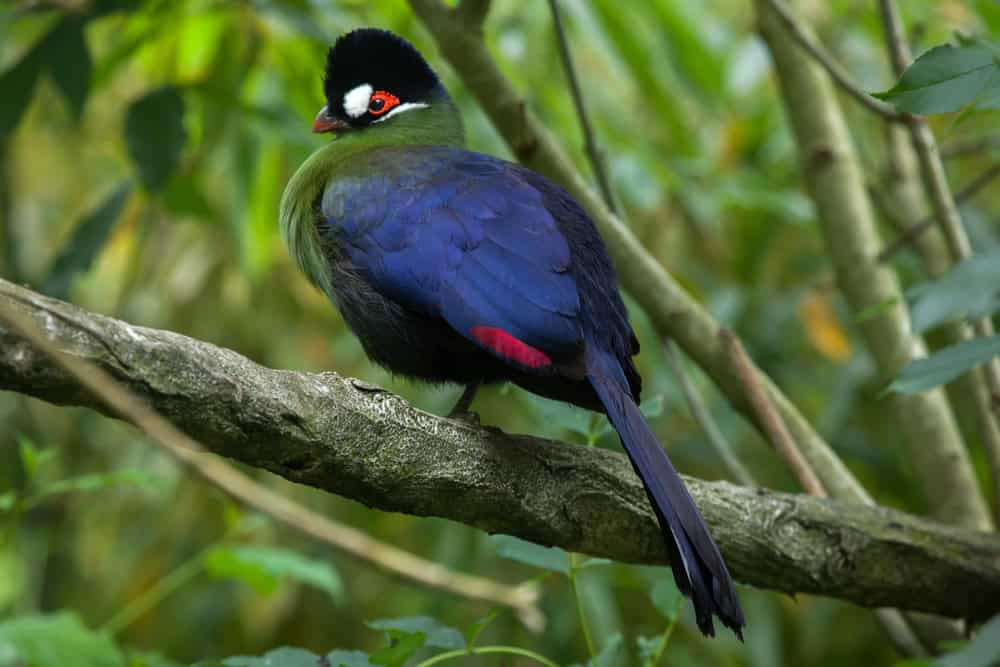 Hartlaub’s Turaco was named to commemorate German physician and ornithologist Gustav Hartlaub. The black crest on its head, red surrounding its eye, and white spot anterior to the eye make for a dramatic presentation. Green plumage decorates its breast while iridescent blue plumage covers its back. Hartlaub’s Turaco can often be identified as the dash of crimson on their underwings flashes brightly amongst a sea of forest green.