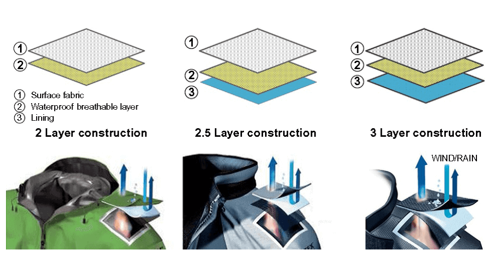 Rain jackets and rain pants are constructed with multiple layers of fabrics. There are 2 layer, 2.5 layer and 3 layer garments.