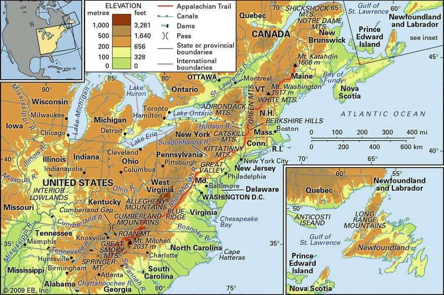 The Northern Appalachians stretch from Newfoundland and Labrador in Canada down to the Hudson River in New York. This section is known for its rugged terrain, colder climate, and large forested areas. The White Mountains in New Hampshire are part of this section as are the Green Mountains in Vermont and the Long Range Mountains in Newfoundland.