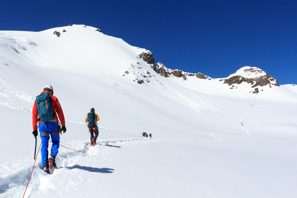 Roping up is mandatory during glacier travel. If one climber falls, the rope catches them. The team then sets anchors and performs a crevasse rescue.