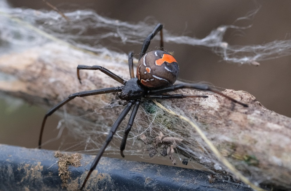 Closely related to the Black Widow, the Redback Spider is native to Australia. Females are black with a prominent red stripe on their upper abdomen and are about 0.4 inches (1 cm) in body length. They build messy, low-lying webs and prefer dry, sheltered environments like sheds or under outdoor furniture.