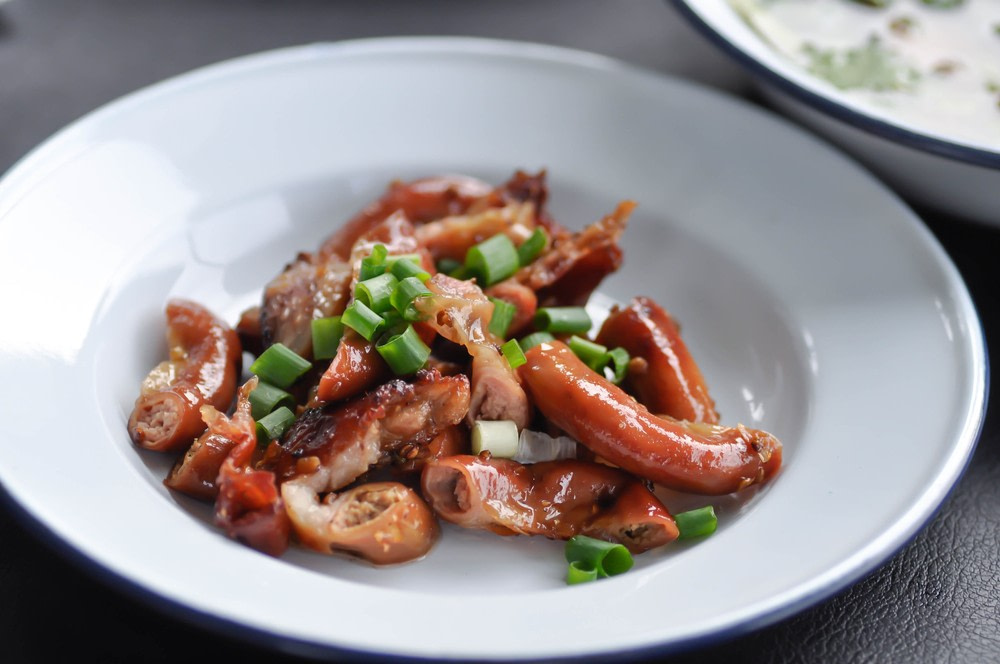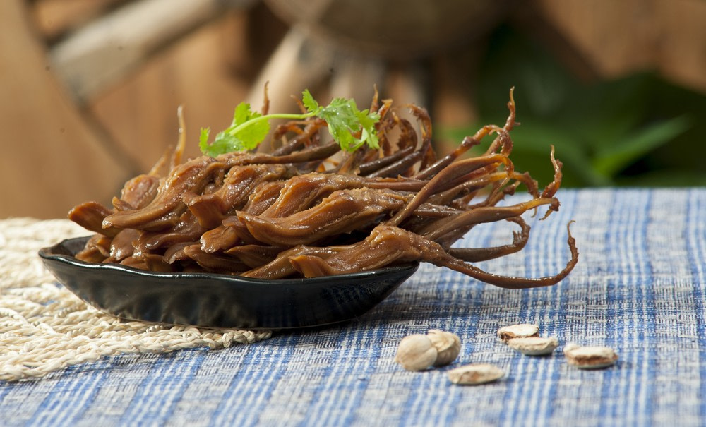 These small, bony tongues are made almost entirely of cartilage and skin. They’re braised in soy sauce, five-spice, and rice wine, or flash-fried for snacks. Each piece has a soft pad of fat at the base and a chewy stem. Popular in Sichuan street food stalls and upscale restaurants alike. The texture is bizarre, and you often have to spit out small bones. Usually eaten cold or as part of a drinking platter.