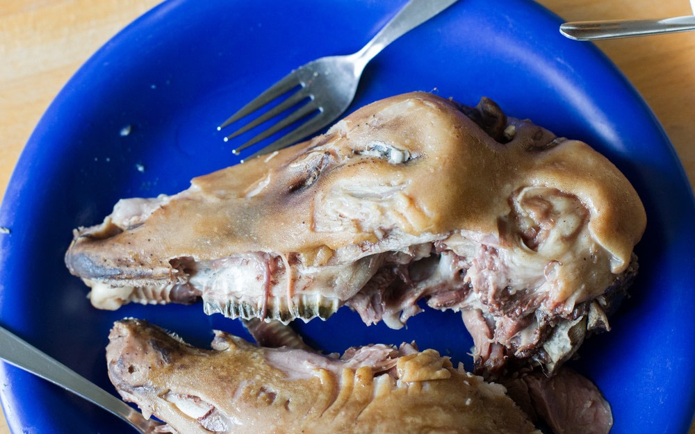 Cuy is a guinea pig, roasted whole and served with the head, teeth, and feet still attached. It’s served splayed on a plate. The meat is dark, rich, and slightly oily, with a taste closer to rabbit than chicken. Common in Andean households and eaten during festivals, birthdays, and national holidays. The visual presentation is what usually stops visitors cold.