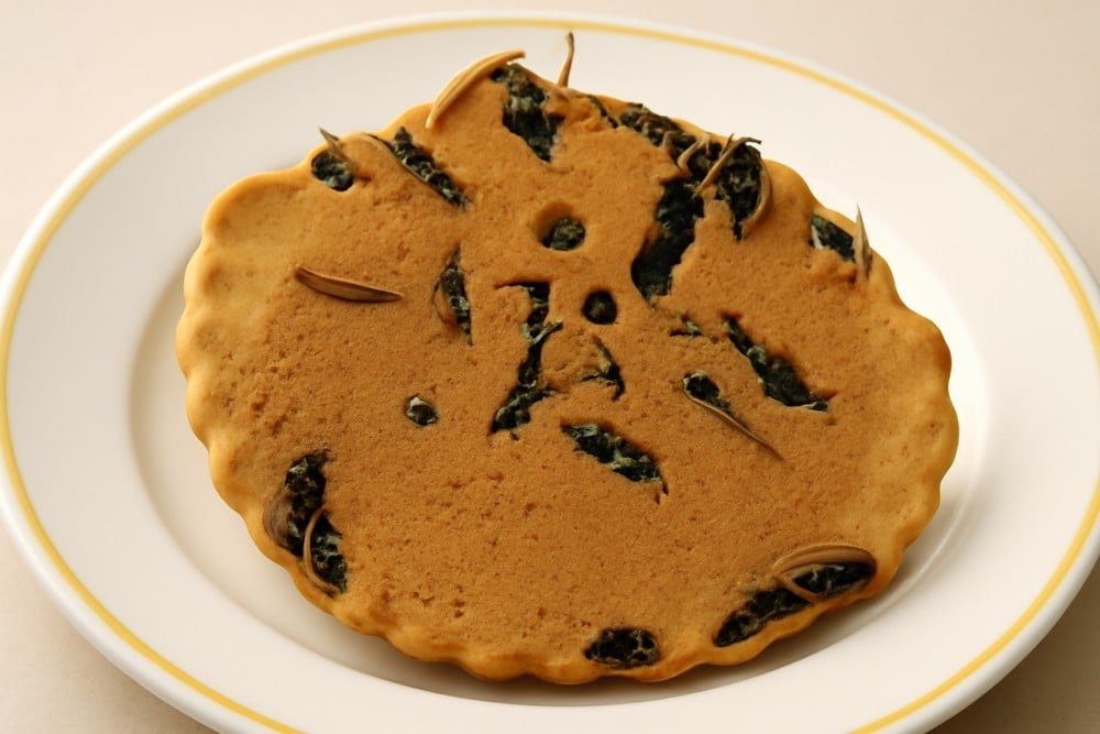 Rice cookies filled with boiled wasps. Made in rural areas where the insects are hand-harvested. The wasps are crunchy, bitter, and packed with protein. Served like snacks or gifts. Looks like chocolate chip cookies, but full of bugs.
