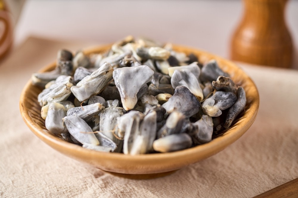 This is a fungal infection of corn, also known as corn smut. The fungus turns kernels into swollen, grey-black masses. It looks rotten, but Mexicans prize it for its earthy, smoky flavor. Cooked in quesadillas, soups, and tamales. Treated like a delicacy, even though it’s classified as a plant disease in the U.S.