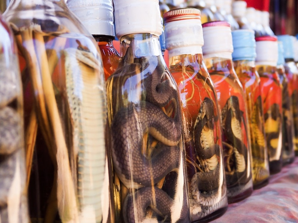 A whole snake, often venomous, is sealed inside a jar of rice wine. The alcohol neutralizes the toxins. Believed to have medicinal benefits. The wine tastes like strong liquor with a reptilian aftertaste. Sometimes drunk in small sips as a shot.